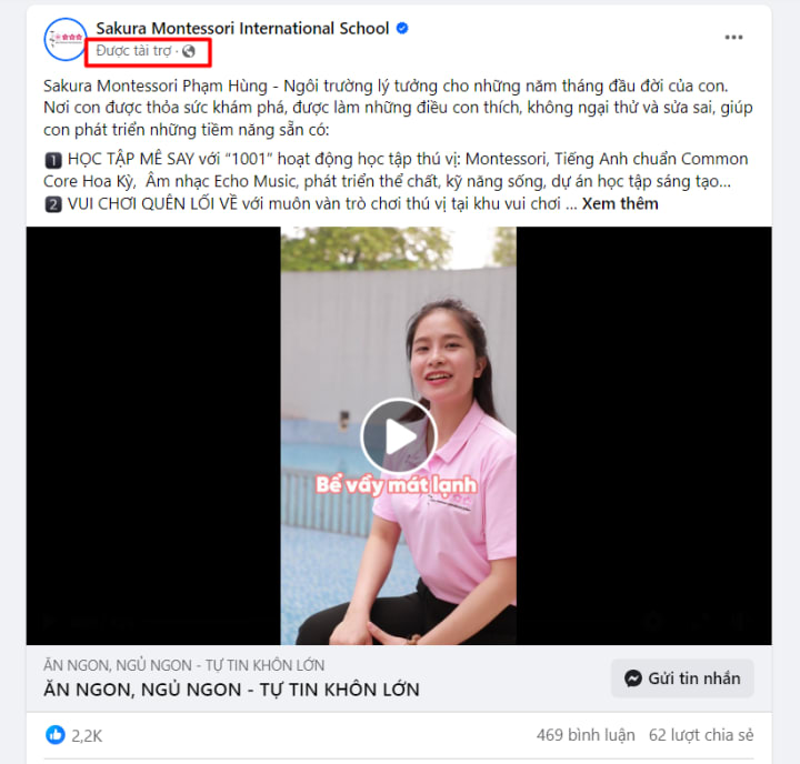 Chạy quảng cáo facebook là việc quảng bá thương hiệu, hình ảnh của trường tới các bậc phụ huynh tiềm năng. Để nhận biết các chiến dịch chạy quảng cáo trên facebook, chủ trường sẽ nhìn thấy cụm từ “Được tài trợ” hoặc (Sponsored) ngay bên dưới tên trường