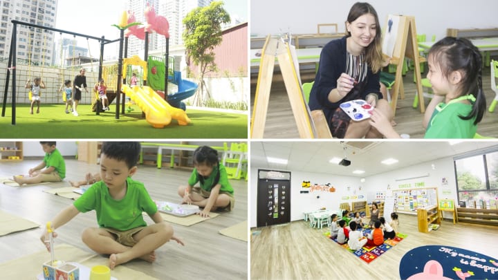 Trẻ cũng được làm quen với Tiếng Anh các giờ học thú vị cùng giáo viên người nước ngoài để phát triển các kỹ năng như: Nghe, phát âm, giao tiếp… Nhà trường có hệ thống lớp học rộng rãi với cửa sổ lớn đón ánh sáng tự nhiên. Sân chơi ngoài trời để trẻ được khám phá thế giới tự nhiên, tha hồ chạy nhảy và vui đùa ngoài trời mà vẫn đảm bảo an toàn.